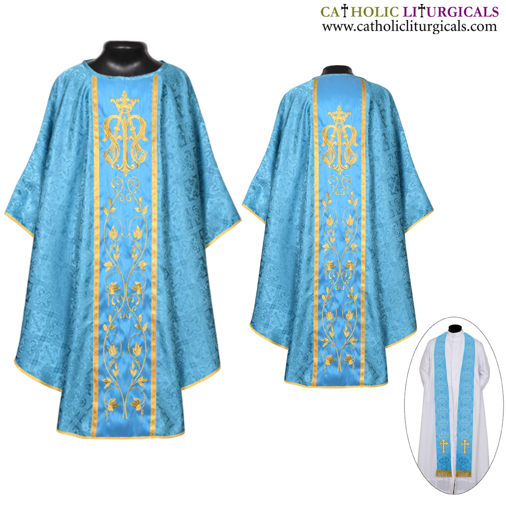 Marian Blue Gothic Chasuble & Stole Set - Ave Maria embroidery