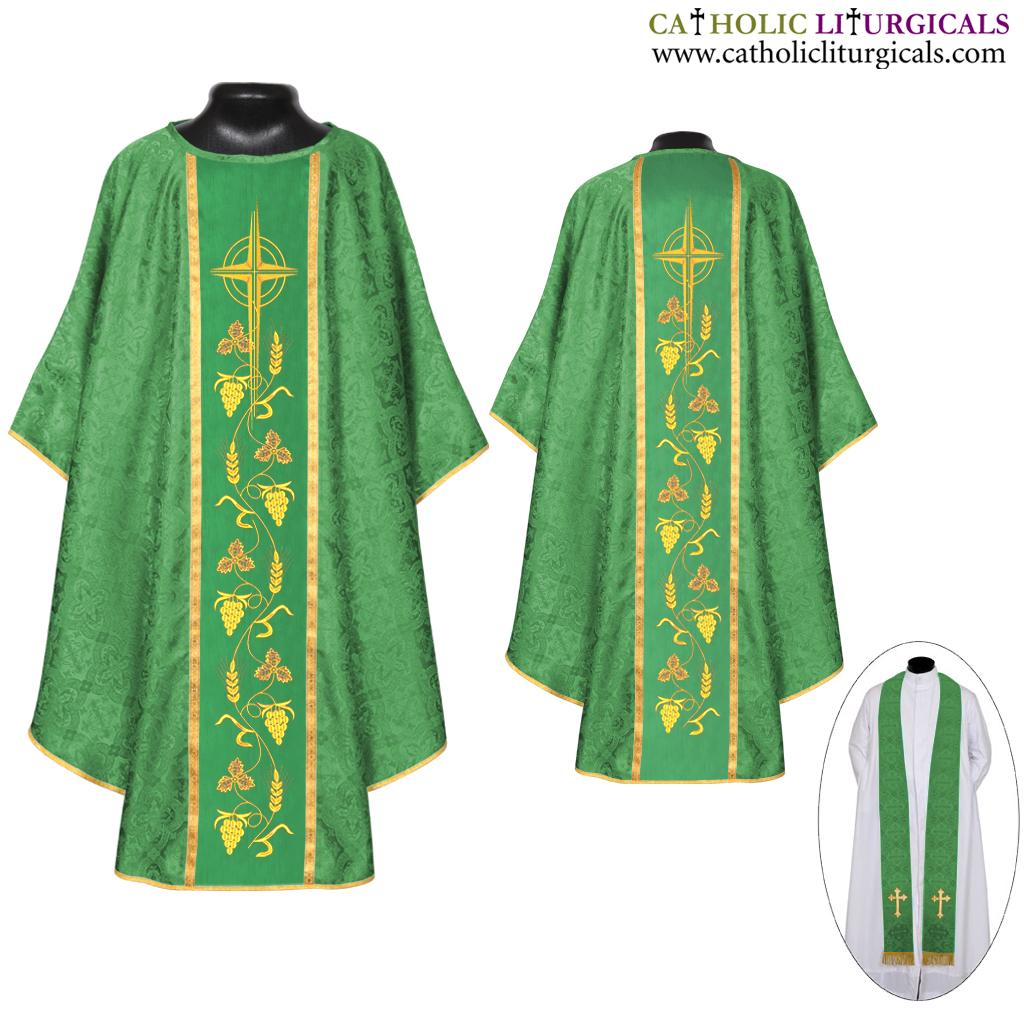 The vestment is made of Church Damask Fabric with Cross and crown of thorn Designs. The orphrey is Embroidered with Cross, Wheat & Grapes Designs. The Vestment comes with a matching Stole, Maniple, Burse & Chalice Veil with matching cross embroidery at the bottom and a small golden cross at the mid point of the Stole and Maniple. The ends of the Stole and Maniple are finished with fine rayon fringes.