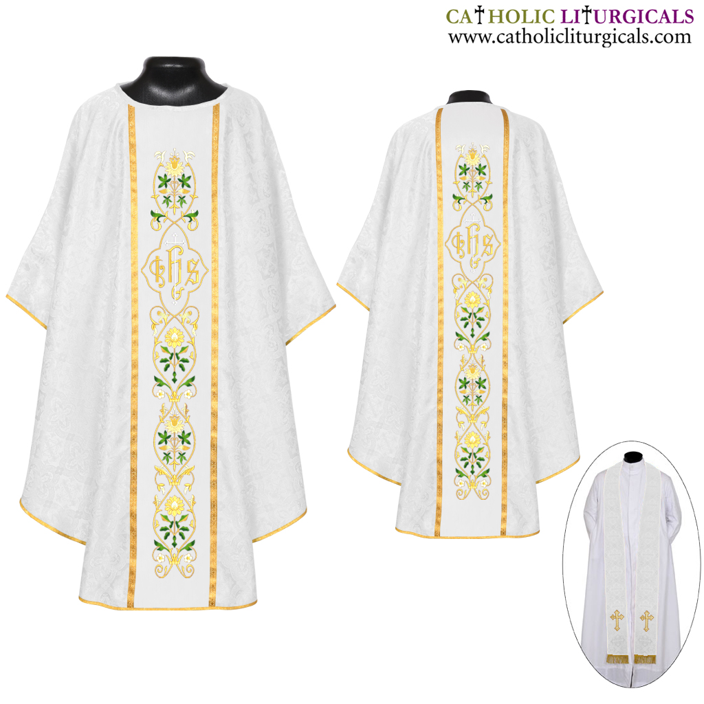 The vestment is made of Church Damask Fabric with Cross Designs. The Orphreys is Embroidered with IHS Designs. The Vestment comes with a matching Stole, Maniple, Burse & Chalice Veil with matching cross embroidery at the bottom and a small golden cross at the mid point of the Stole and Maniple. The ends of the Stole and Maniple are finished with fine rayon fringes.