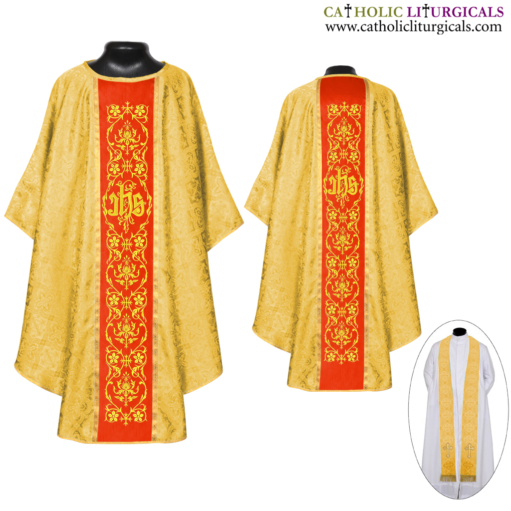 The vestment is made of Church Damask Fabric with Cross Designs. The Orphrey is Embroidered with IHS and Cross Designs. The Vestment comes with a matching Stole, Maniple, Burse & Chalice Veil with matching cross embroidery at the bottom and a small golden cross at the mid point of the Stole and Maniple. The ends of the Stole and Maniple are finished with fine rayon fringes.
