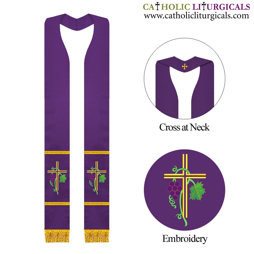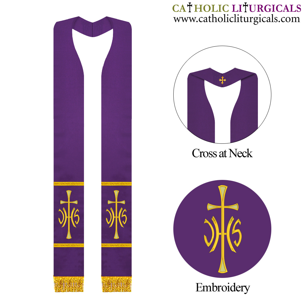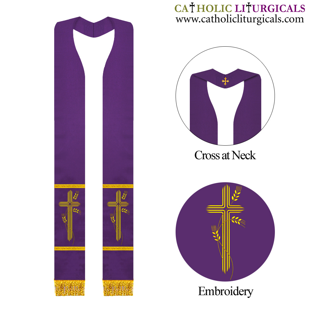 The vestment is accompanied by a matching stole, a vital accessory in spiritual rituals. The stole measures 48 inches, featuring a cross at the bottom and a delicate golden cross on the back of the neck. Fringes at the ends add a touch of elegance.