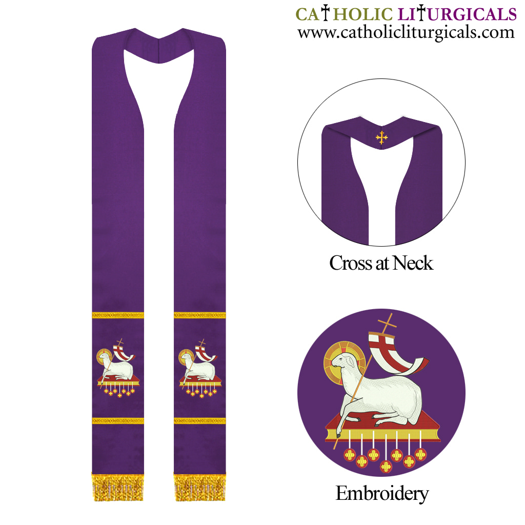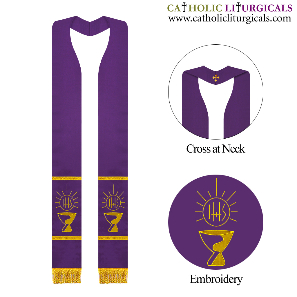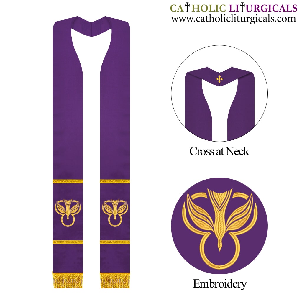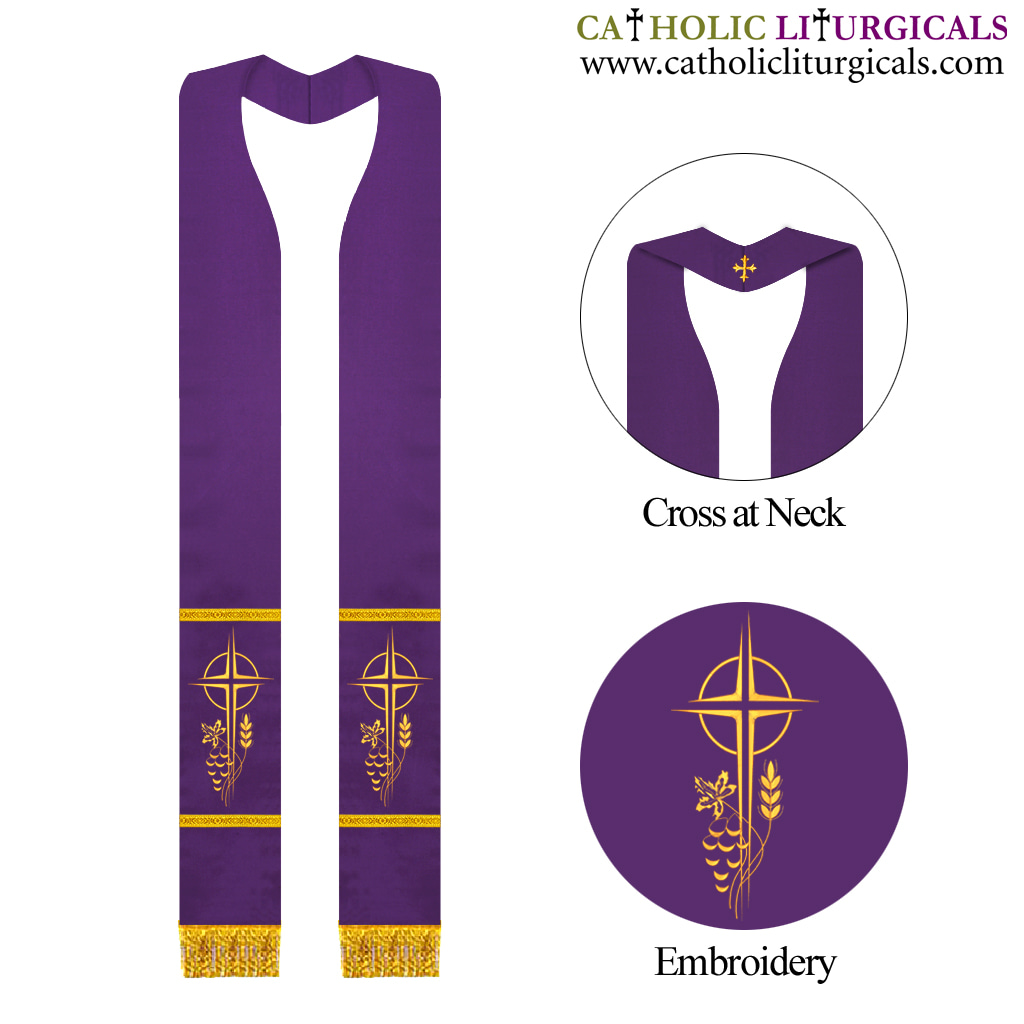 The vestment is accompanied by a matching stole, a vital accessory in spiritual rituals. The stole measures 48 inches, featuring a cross at the bottom and a delicate golden cross on the back of the neck. Fringes at the ends add a touch of elegance.
