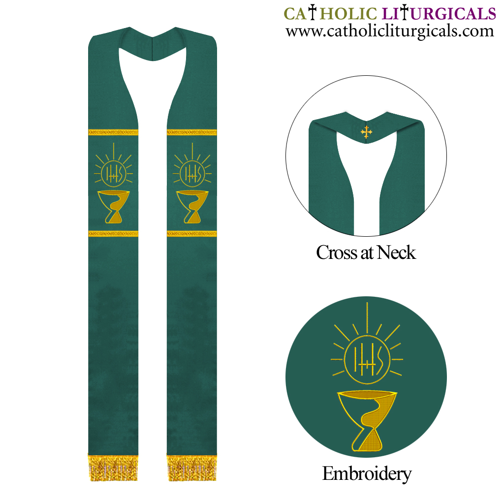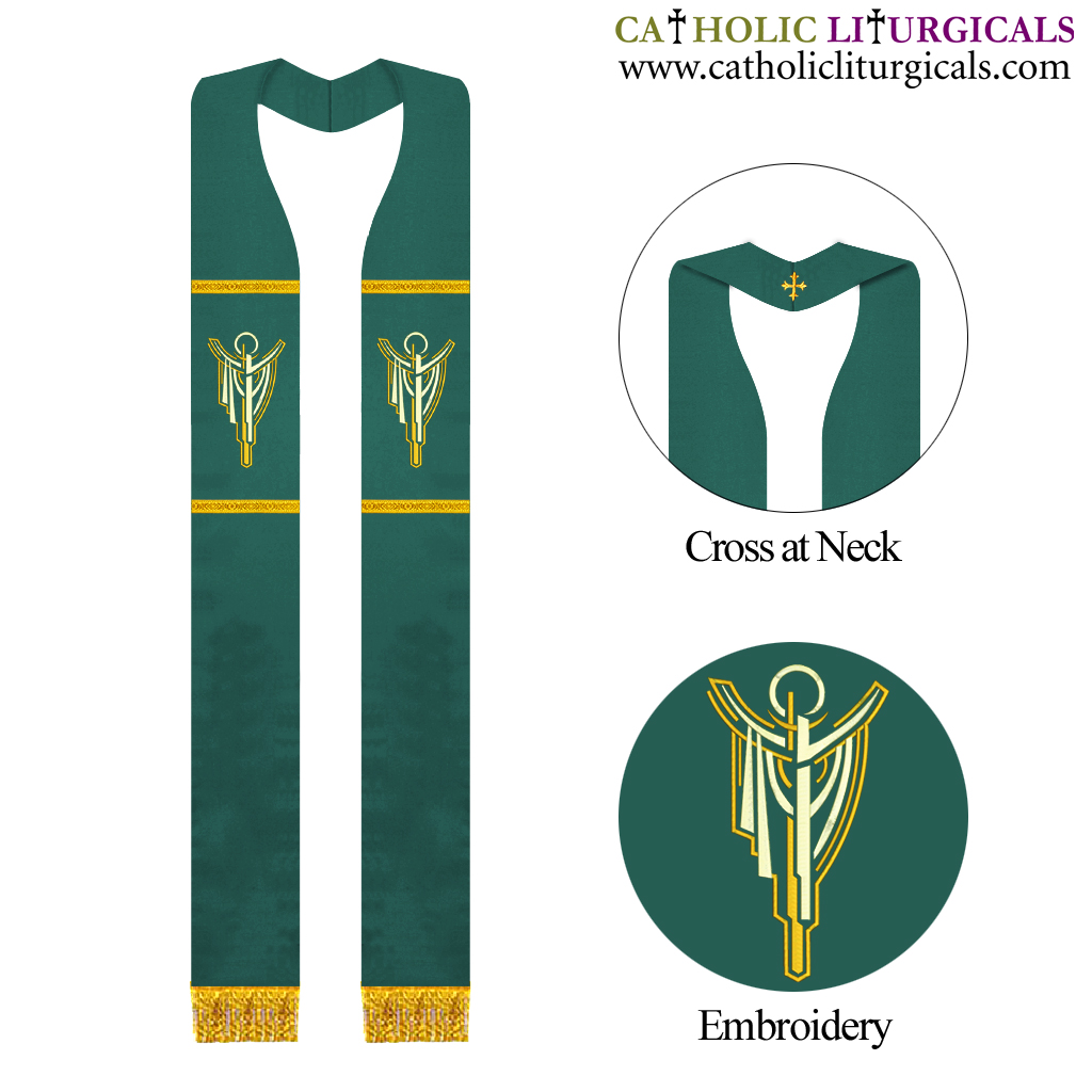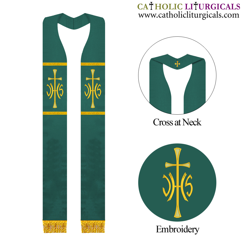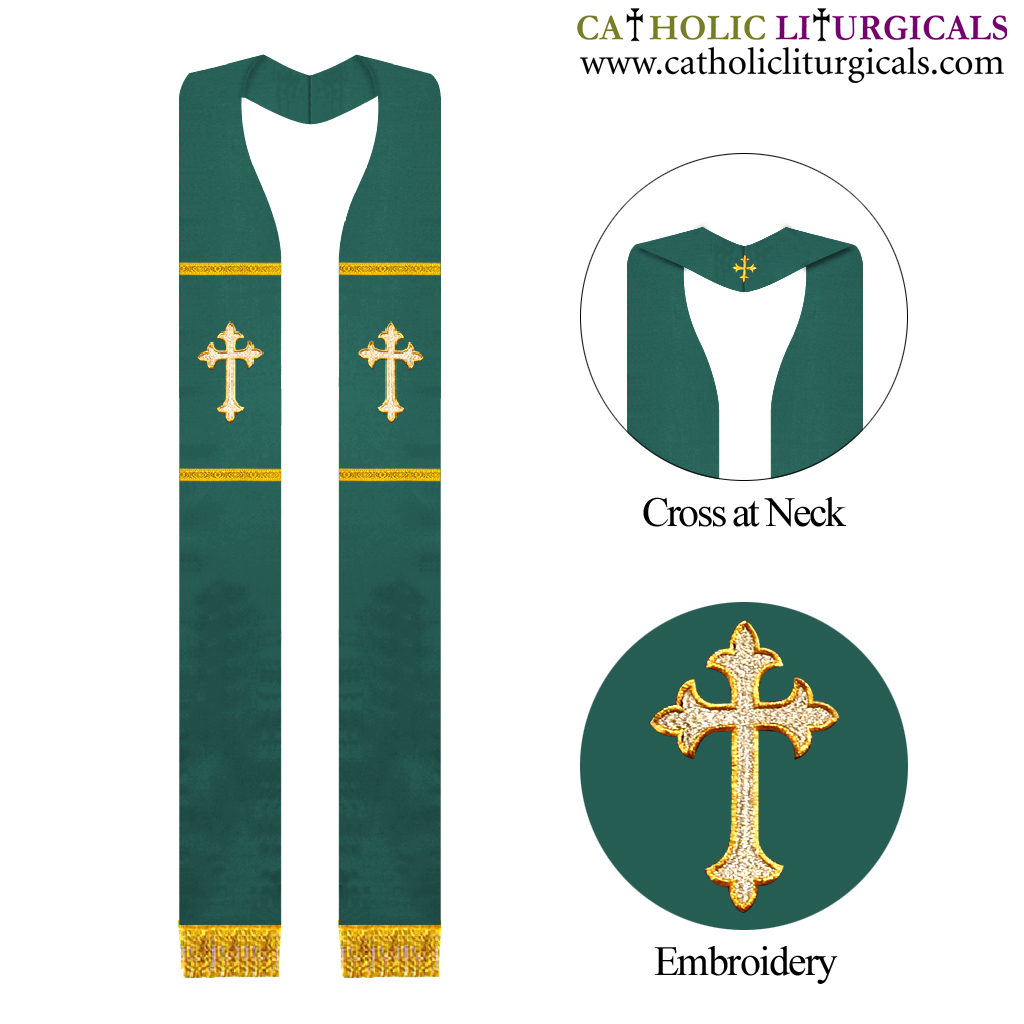 The vestment is accompanied by a matching stole, a vital accessory in spiritual rituals. The stole measures 48 inches, featuring a cross at the bottom and a delicate golden cross on the back of the neck. Fringes at the ends add a touch of elegance.