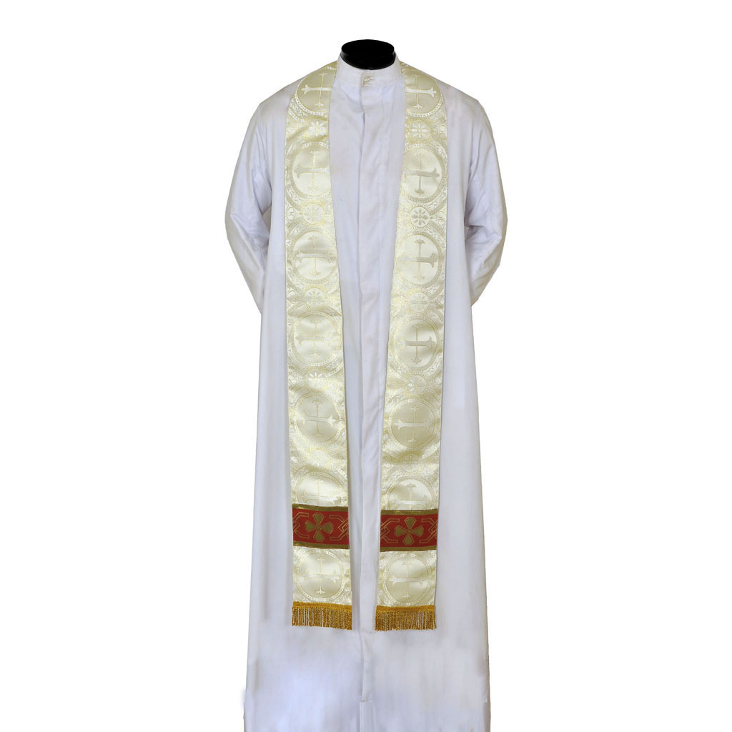 The benediction cope vestment is accompanied by a matching stole, and measures 48 inches, featuring a cross at the ends and a cross on the back of the neck. Fringes at the ends add a touch of elegance.