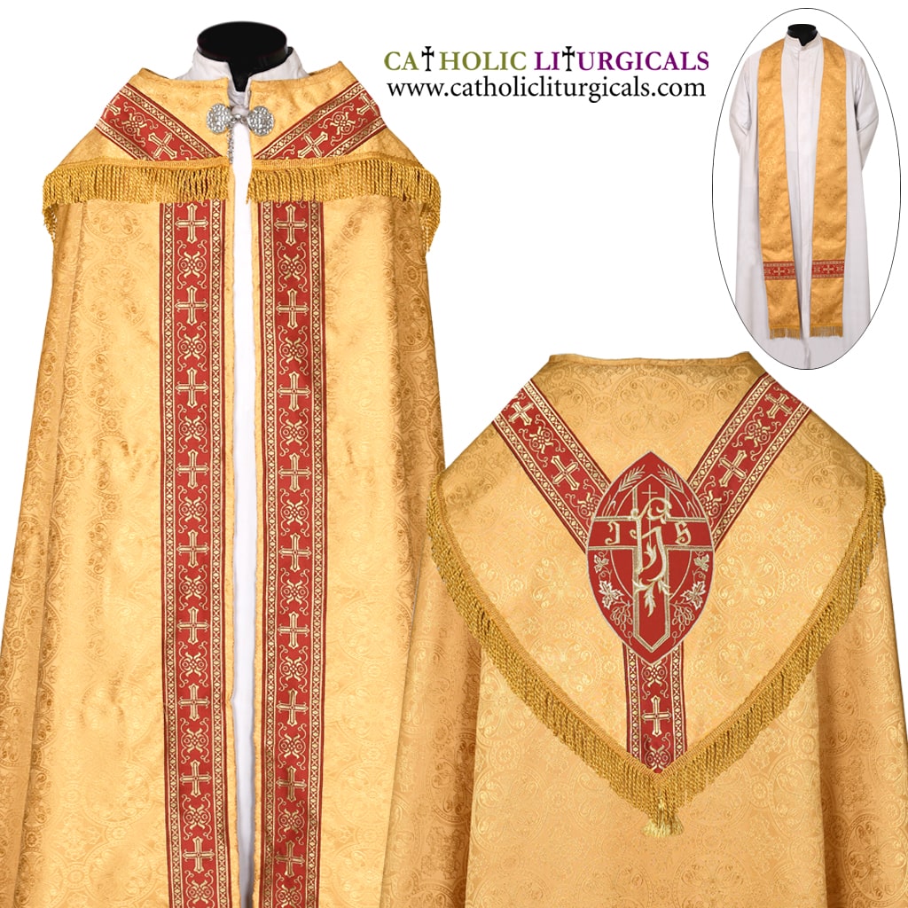 The benediction cope vestment is accompanied by a matching stole, and measures 48 inches, featuring a cross at the ends and a cross on the back of the neck. Fringes at the ends add a touch of elegance.