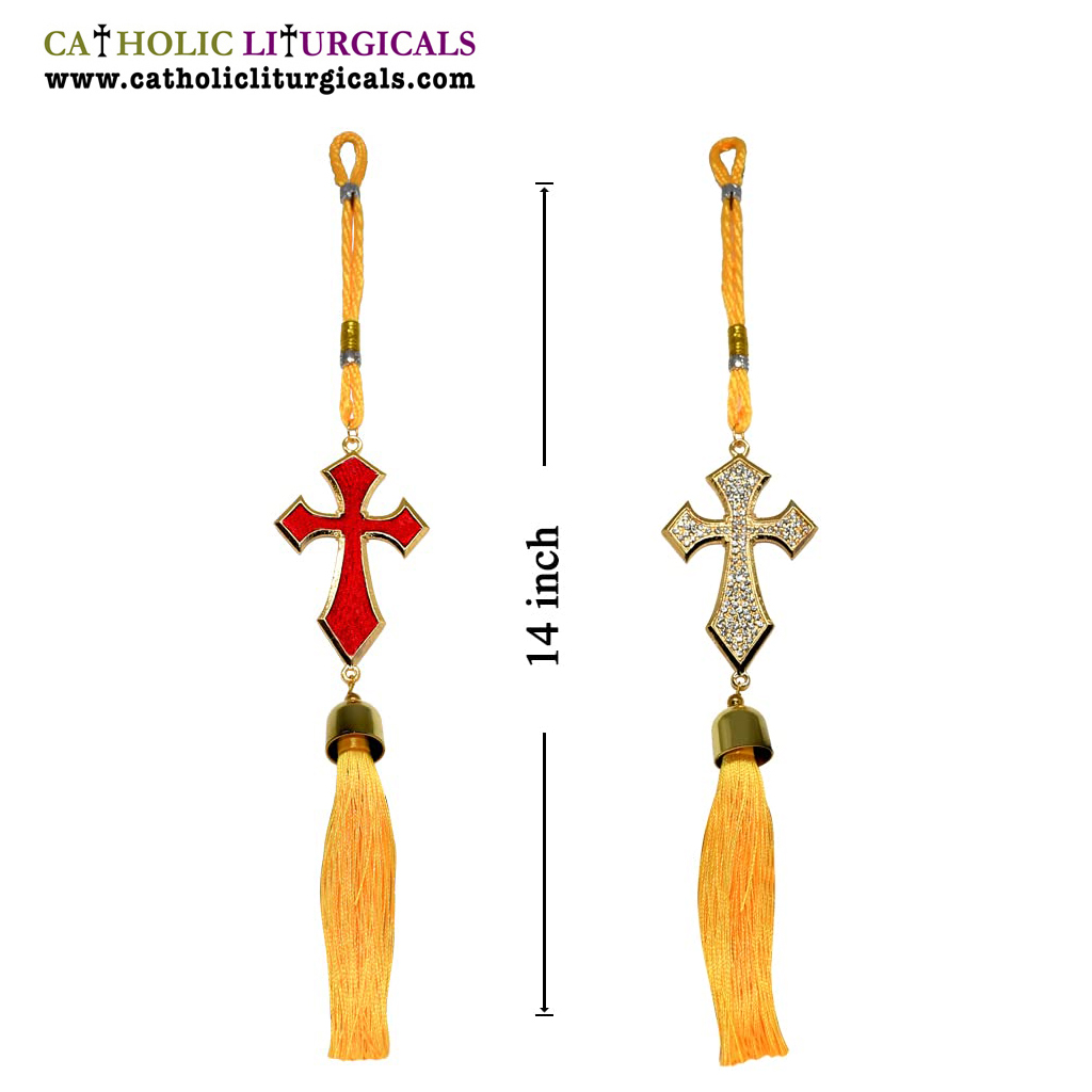 Christian Hanging Cross for Car & Home Decor Universal Fit(For all types of car), dual side visibility, clear vision - no blockage. Cross Comes Metal Alloy - Gold Plated; Yellow color threads for tassel & dori