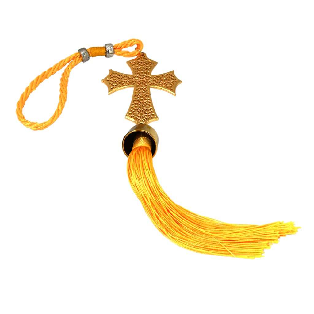 Christian Hanging Cross for Car & Home Decor Universal Fit(For all types of car), dual side visibility, clear vision - no blockage. Cross Comes Metal Alloy - Gold Plated; Yellow color threads for tassel & dori