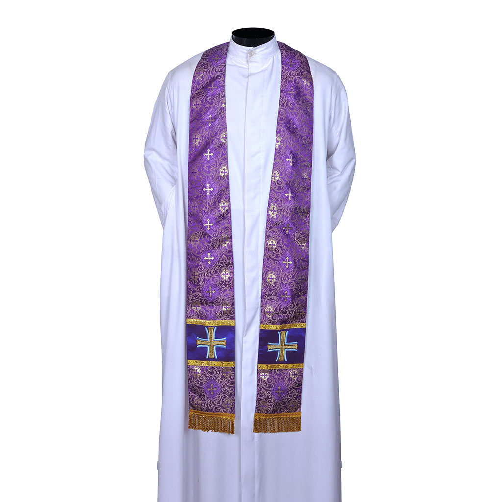 The vestment is accompanied by a matching stole, a vital accessory in spiritual rituals. The stole measures 48 inches, featuring a cross at the bottom and a delicate golden cross on the back of the neck. Fringes at the ends add a touch of elegance.