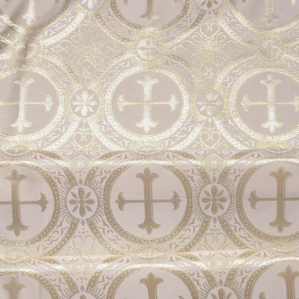 Offered here is Brocade fabric made of Polyester yarn & Metallic Gold / Silver yarns with (approx) 7.5 inches repeated cross design. The width of the fabric is 56 inches and the fabric is sold by meters (1 meter = 1.1 yard). This is to ensure that you get complete patterns, so as to avoid wastage. The maximum size of the bolt is 20 meters. So if you order 20 meters, you will receive them as a single piece.